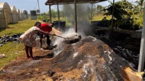 Workers at Kamassah’s farm in Ghana prepare growing medium, which is a mixture of burnt rice husks. Photo credit: CS Liew
